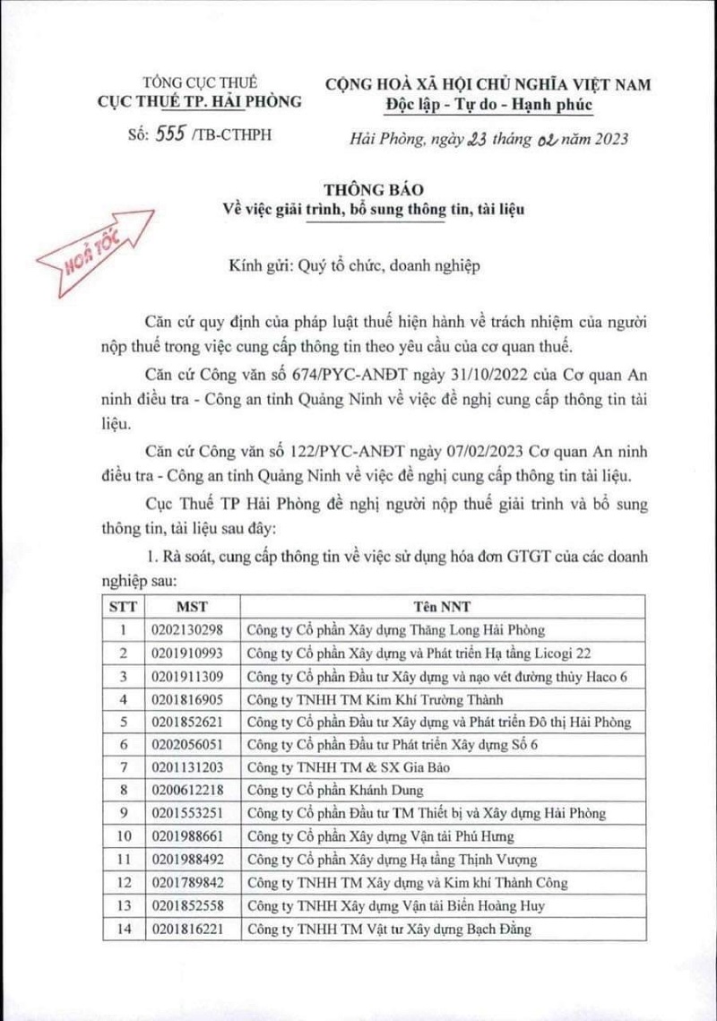 Vị trí của bạn: Cục thuế Hải Phòng yêu cầu rà soát, cung cấp thông tin về việc sử dụng hóa đơn GTGT, nội dung như sau: