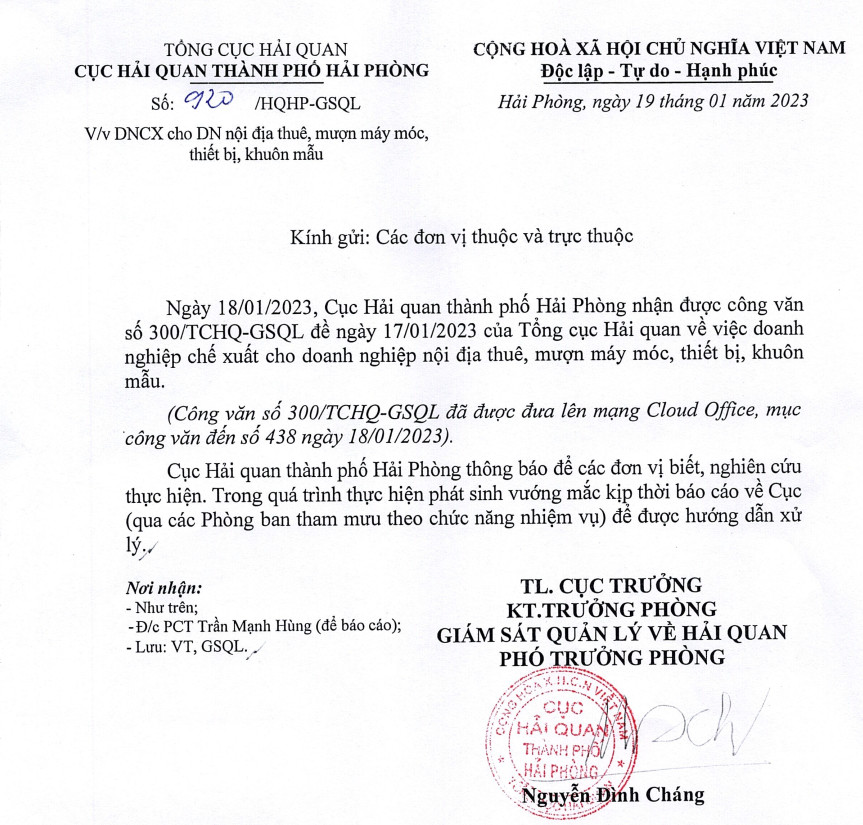 Vị trí của bạn: Ngày 18/01/2023, Cục Hải quan thành phố Hải Phòng nhận được công văn số 300/TCHQ -GSQL đề ngày 17/01/2023 của Tổng cục Hải Quan về việc quy định DNCX cho DN nội địa thuê mượn máy móc, thiết bị, khuôn mẫu.